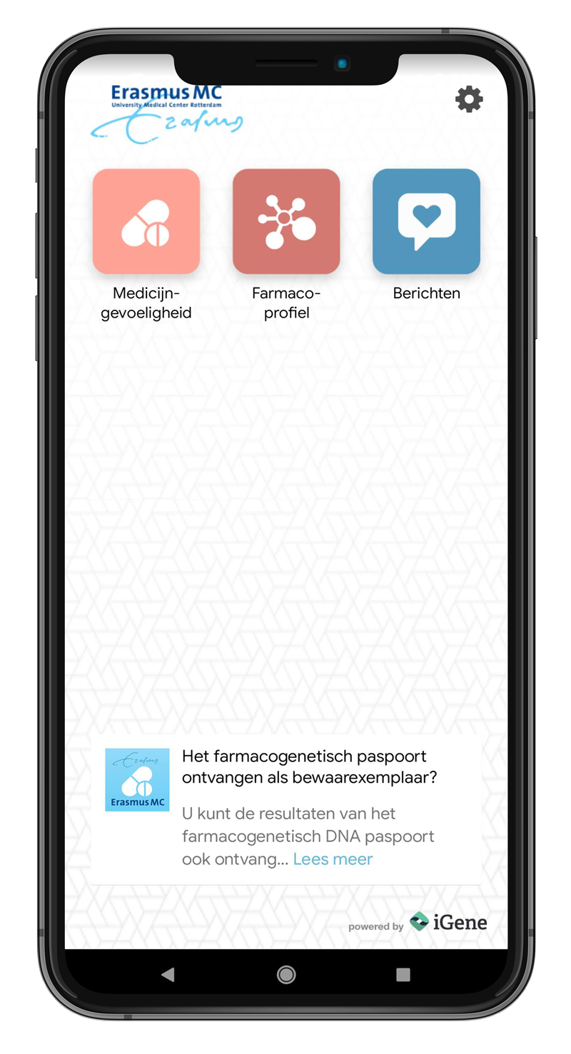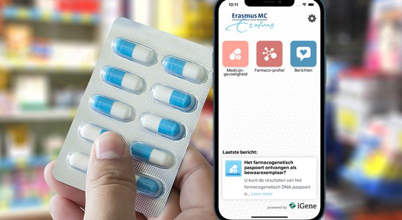 Hierbij is dan ook gelijk alle medicatie zichtbaar in relatie tot de DNA informatie. De app is te vinden onder “Farmacogenetica Profiel” in de Apple Appstore en in de Android Google Playstore. Dit is mogelijk gemaakt door een exclusieve samenwerking tussen het Internationaal Expertisecentrum Farmacogenetica van de Afdeling Klinische Chemie van het Erasmus MC en de firma iGene.