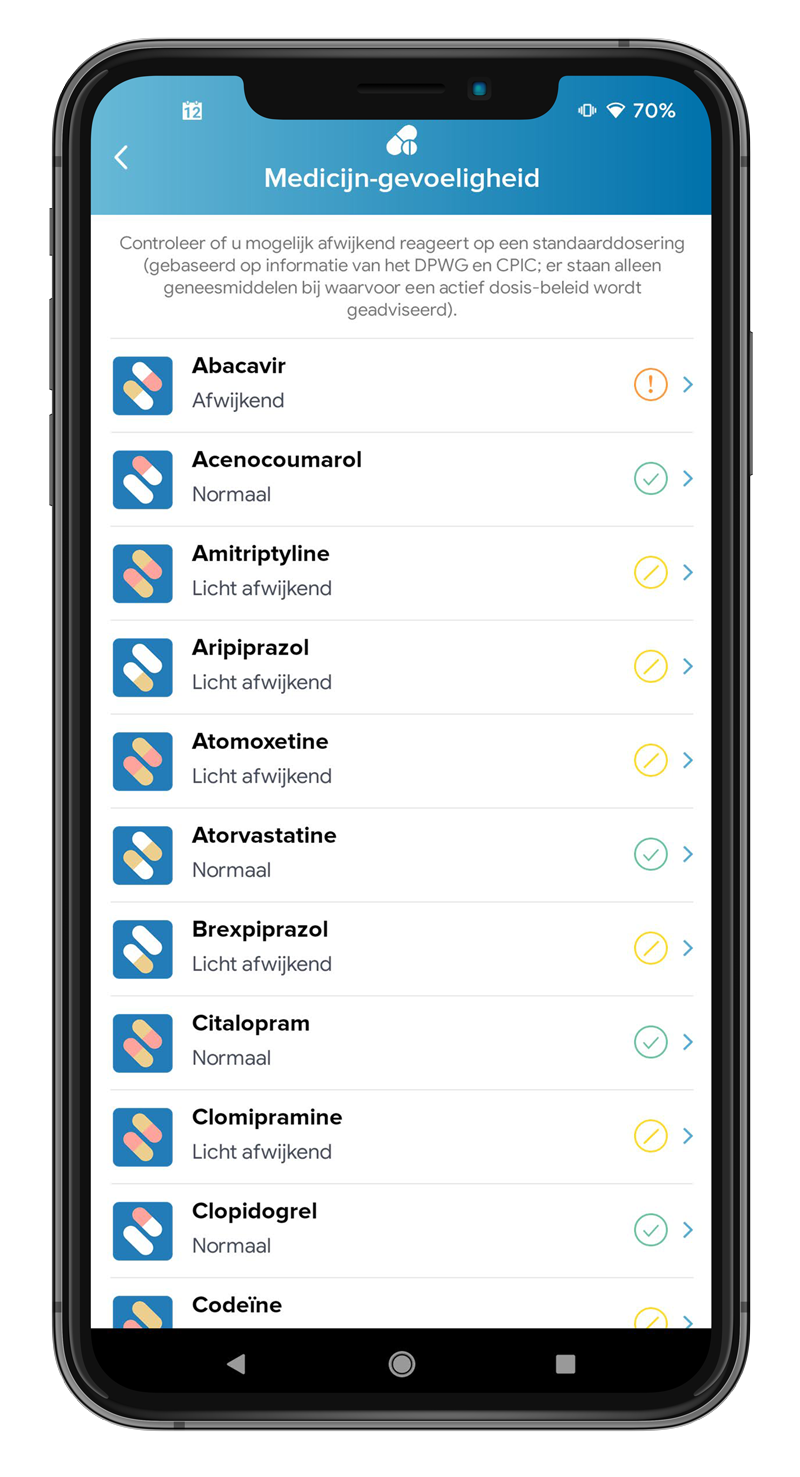 Als u via uw behandelaar een farmacogenetisch profiel laat maken bij het Erasmus MC in Rotterdam, dan kunt u met deze app uw uitslagen direct raadplegen. Zo heeft u uw profiel altijd bij de hand. Daarnaast heeft u het voordeel dat er updates plaatsvinden in het geval er nieuwe medicatie wordt toegevoegd of de doseringsadviezen worden aangescherpt.